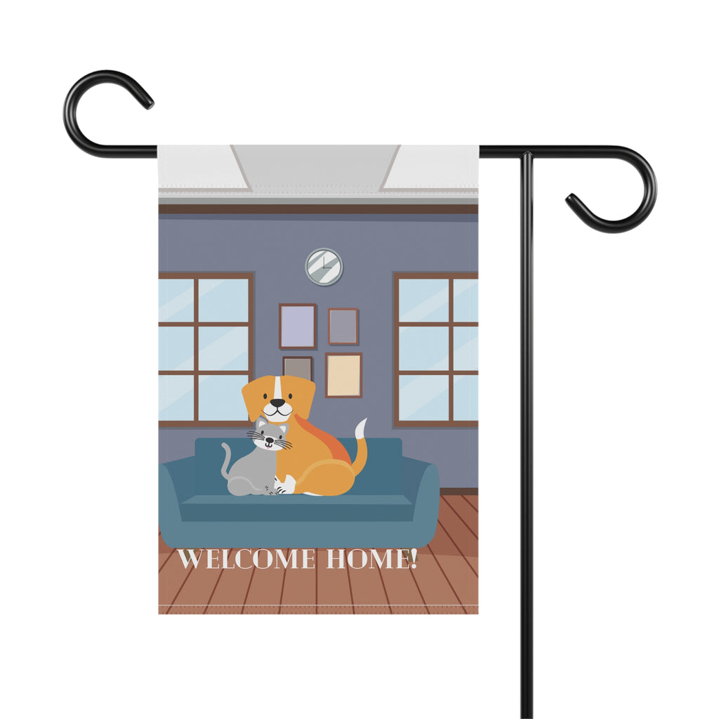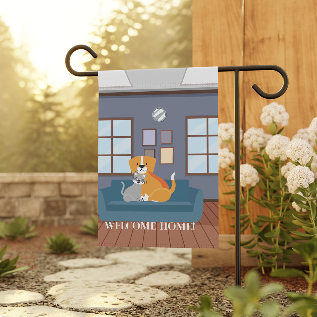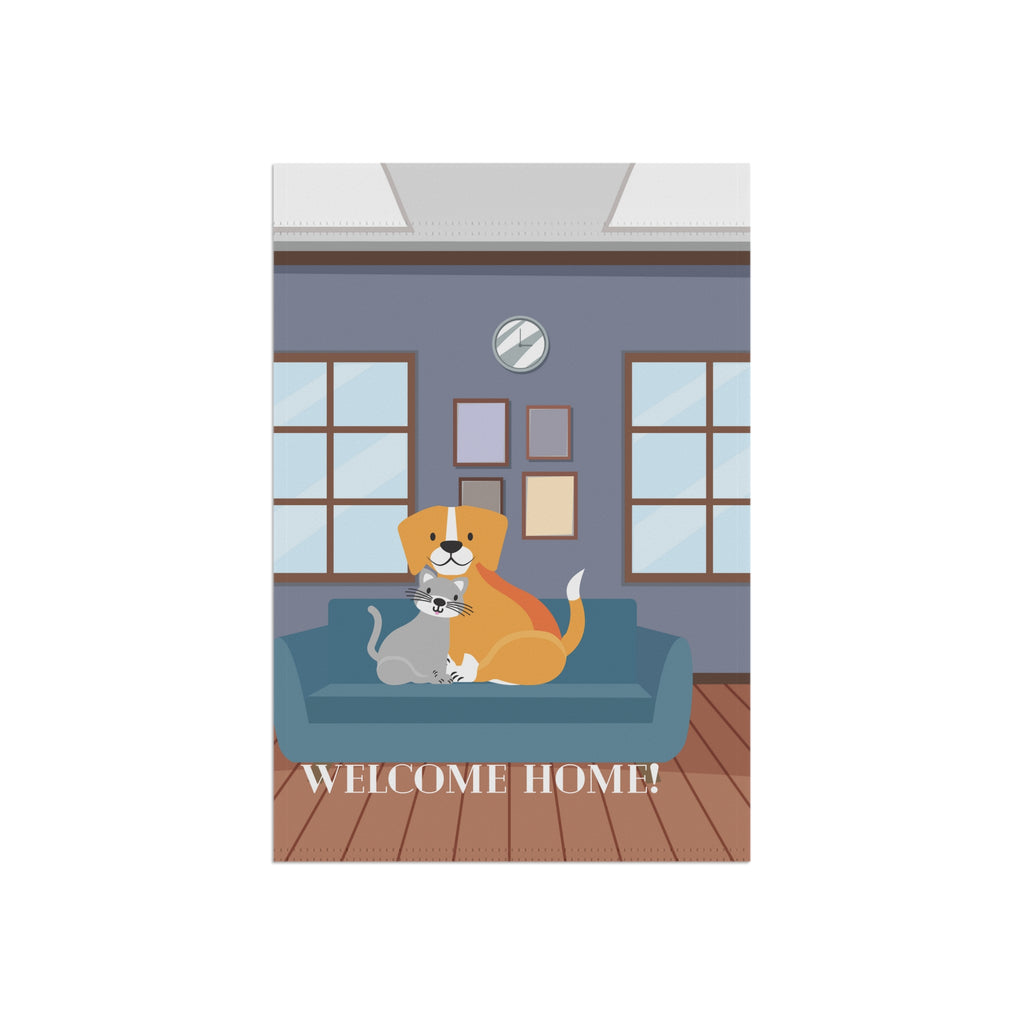 A delightful yard flag featuring a cozy dog and cat eagerly awaiting your return home! The scene exudes comfort and companionship, with vibrant colors and cheerful details evoking a sense of homecoming joy. It's a heartwarming greeting for anyone arriving at your doorstep.