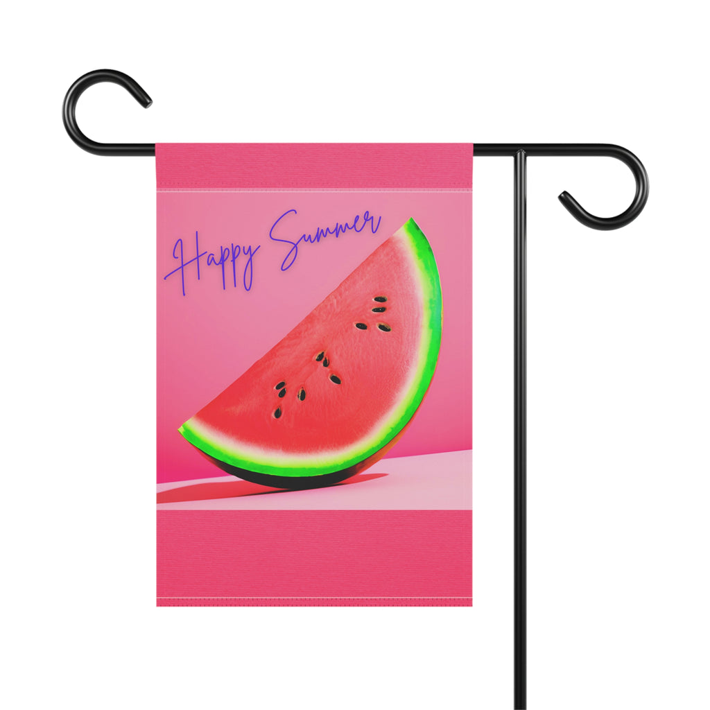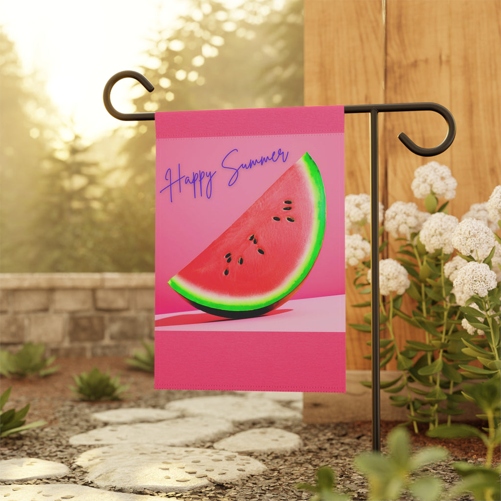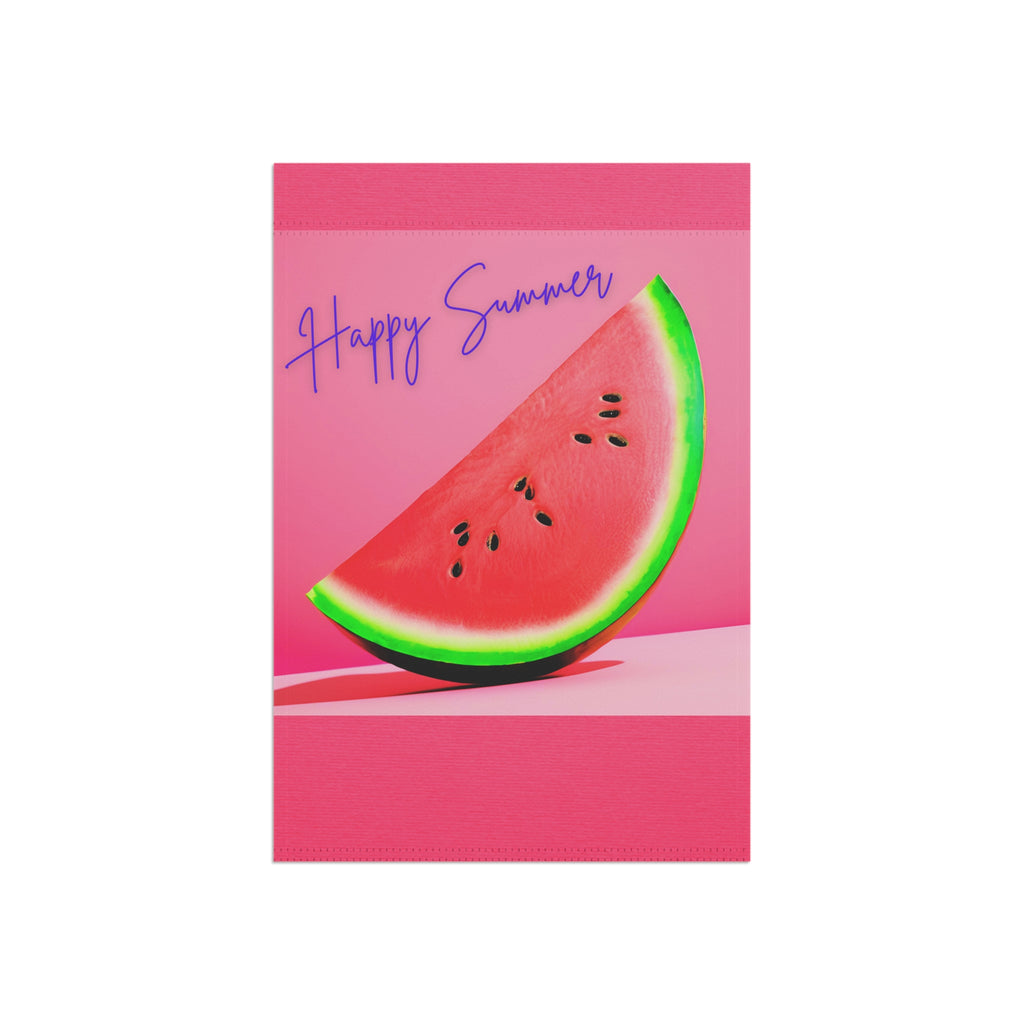 A vibrant yard flag features a juicy watermelon slice, seeds glistening, on a bold pink background. The cheerful design captures summer's essence, adding a playful, refreshing touch to any outdoor space.