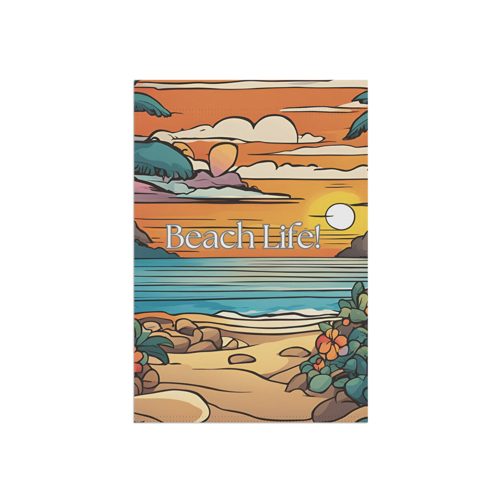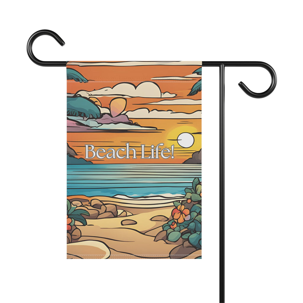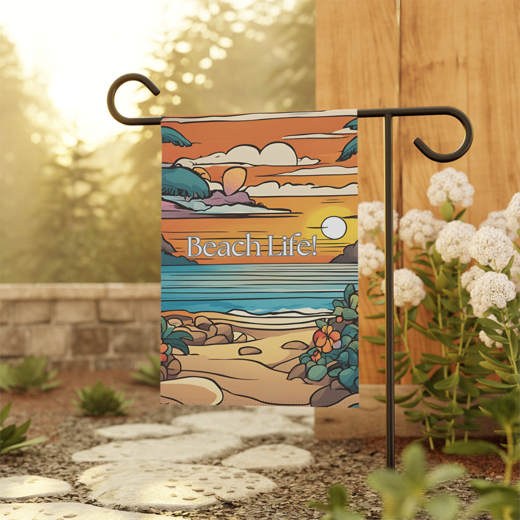 Bright colors and tropical elements capture the essence of a relaxing beach sunset, perfect for adding a touch of coastal charm to your outdoor space. Beach life is the best!