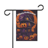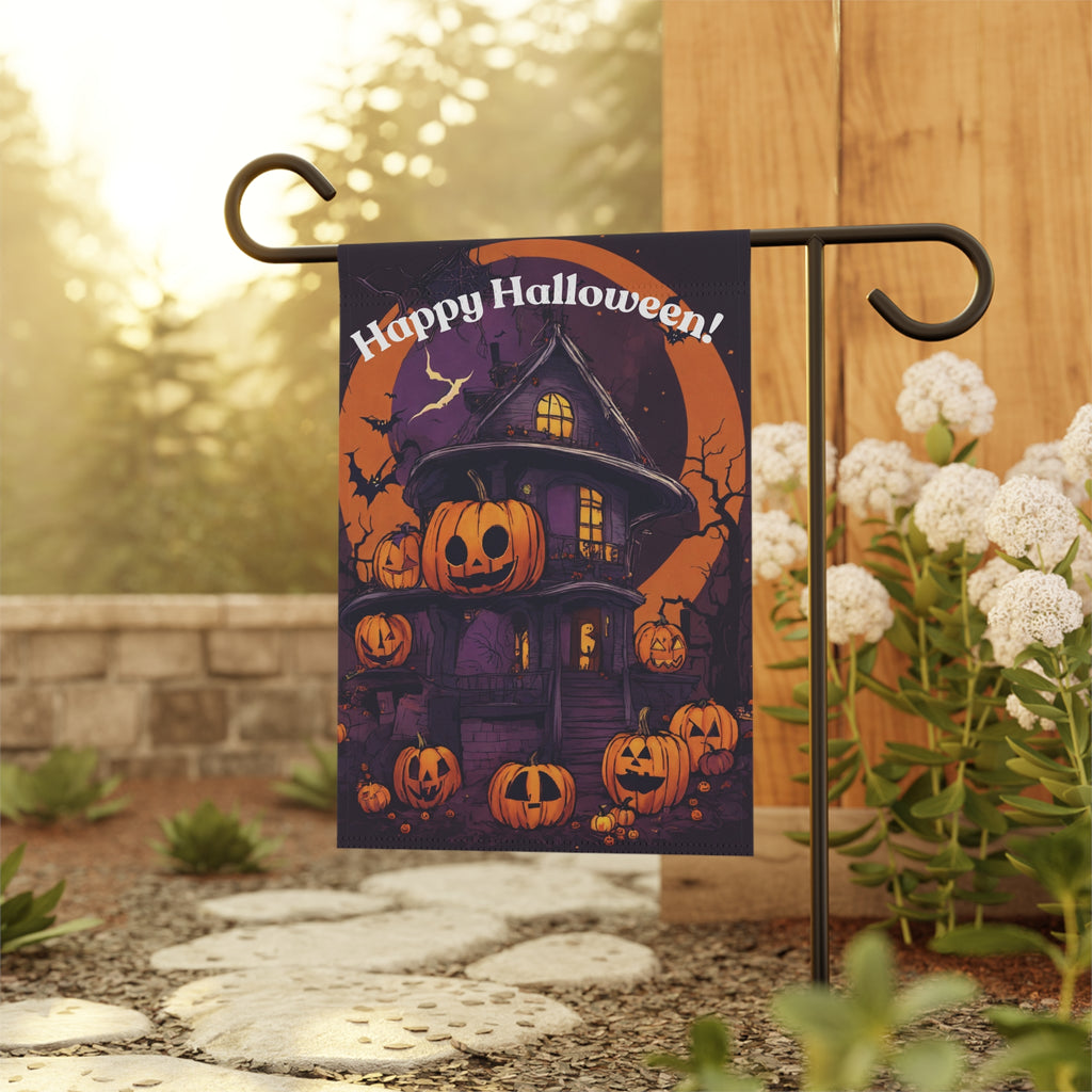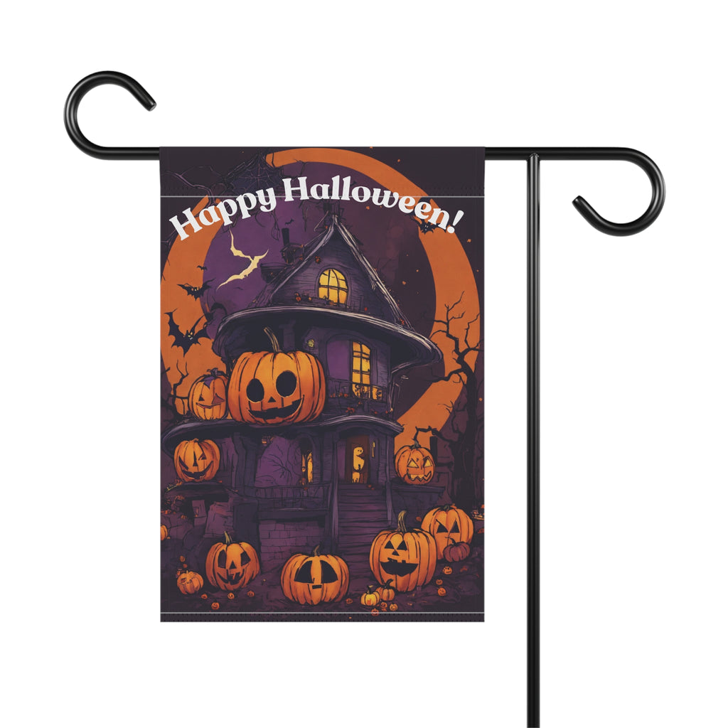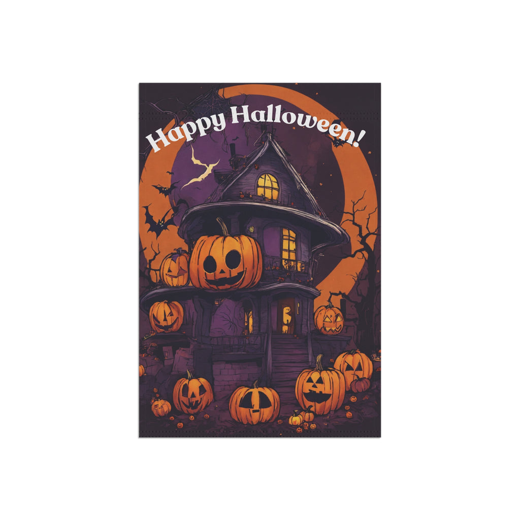 A spooky Halloween yard flag features a haunted house, eerie trees, and a full moon. Bats soar across the night sky, while ghosts and pumpkins add a chilling touch. Ideal for creating a haunted atmosphere in your outdoor decorations. Your design goes in crisp detail and color on both sides of the flag.