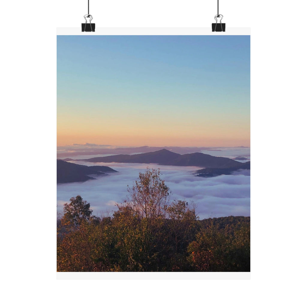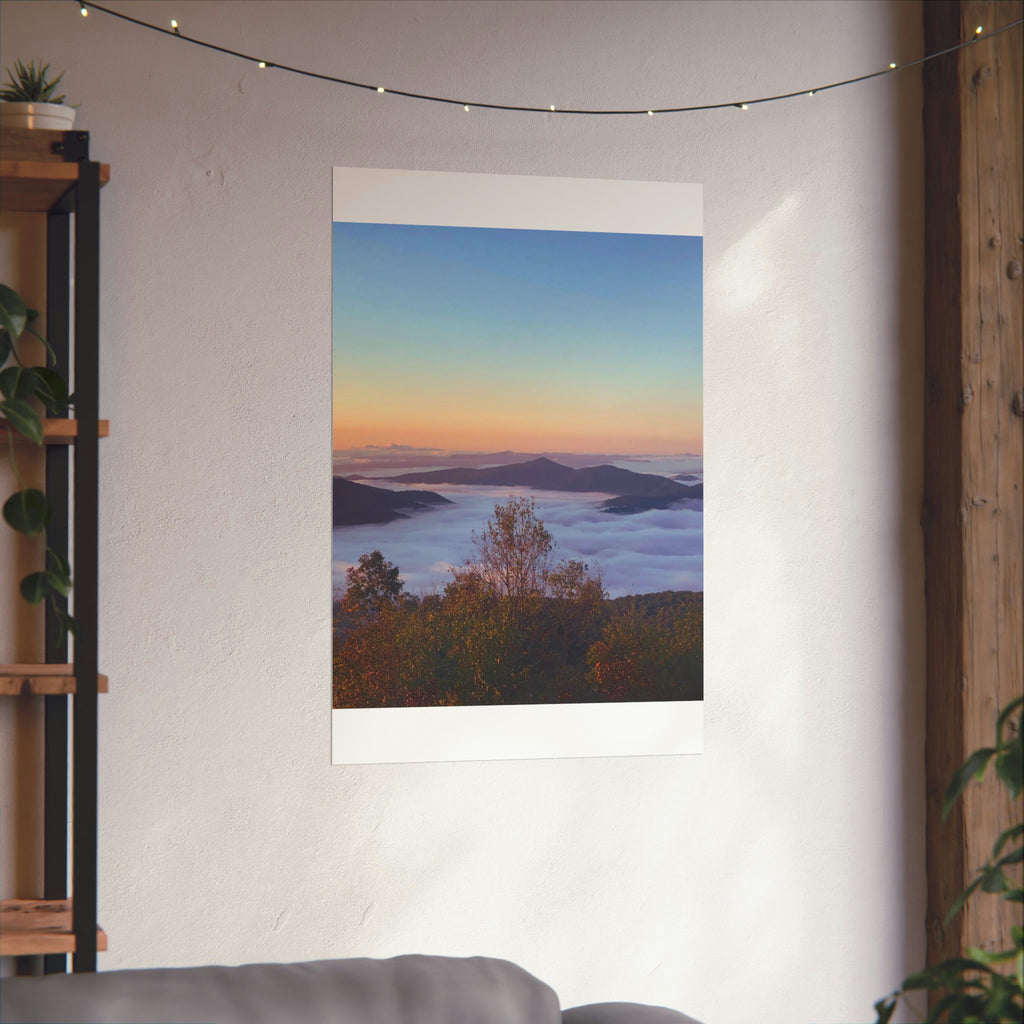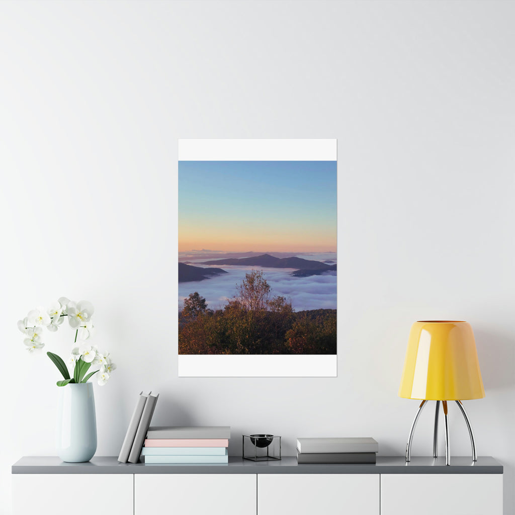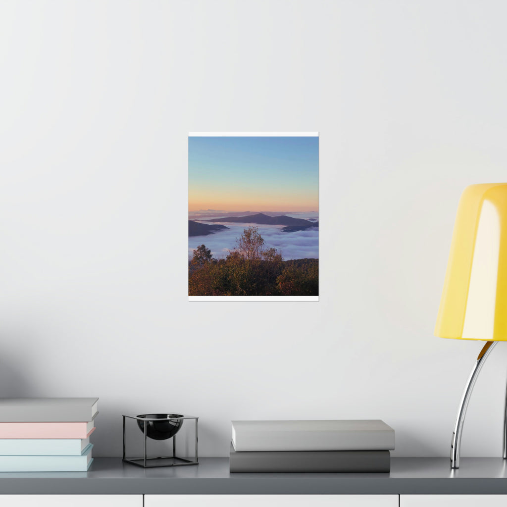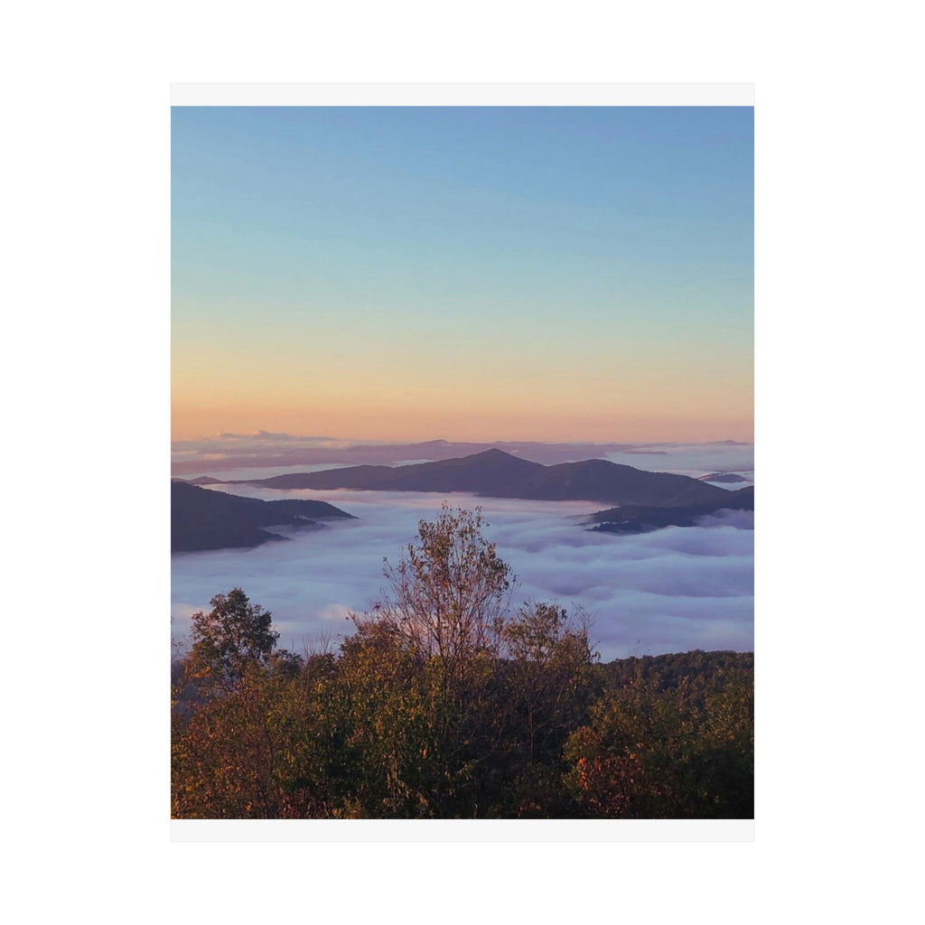 As dawn breaks over the Blue Ridge Parkway, misty clouds cloak the majestic mountains, casting an ethereal aura. Shades of blue and gray merge seamlessly, with hints of golden sunlight piercing through the mist, painting a breathtaking scene. Enjoy this wonderfully framed picture of this beautiful landscape.
