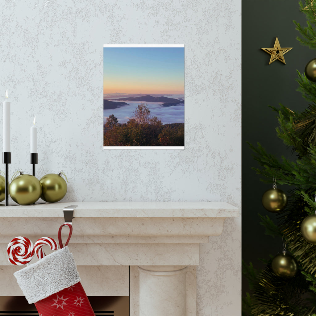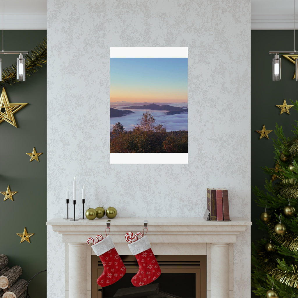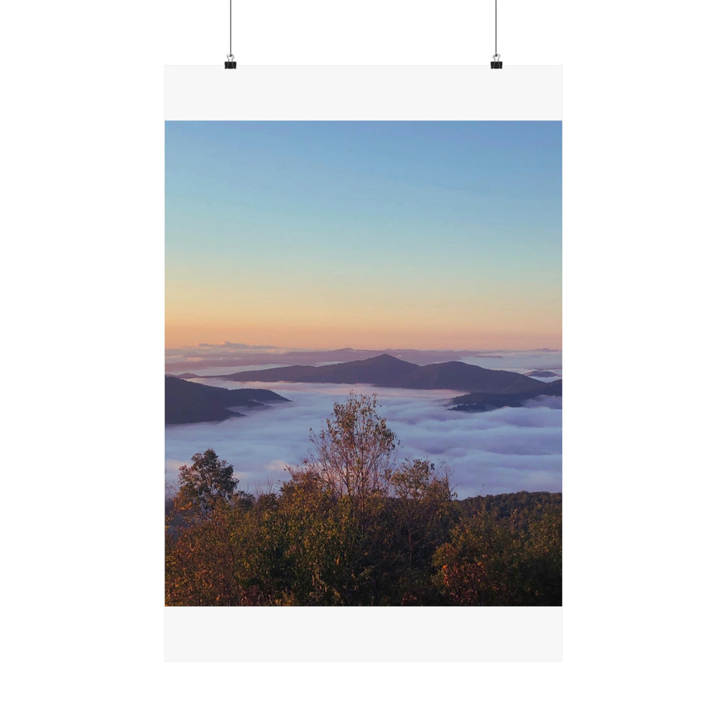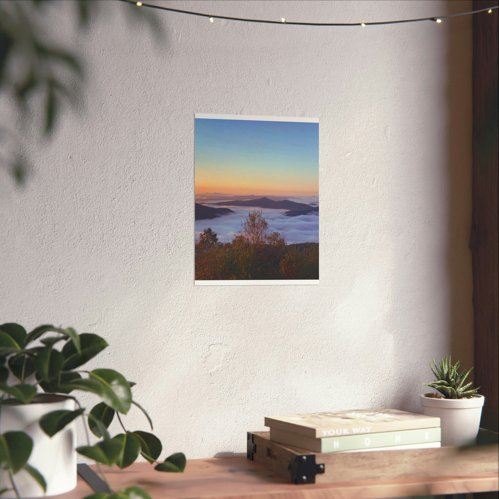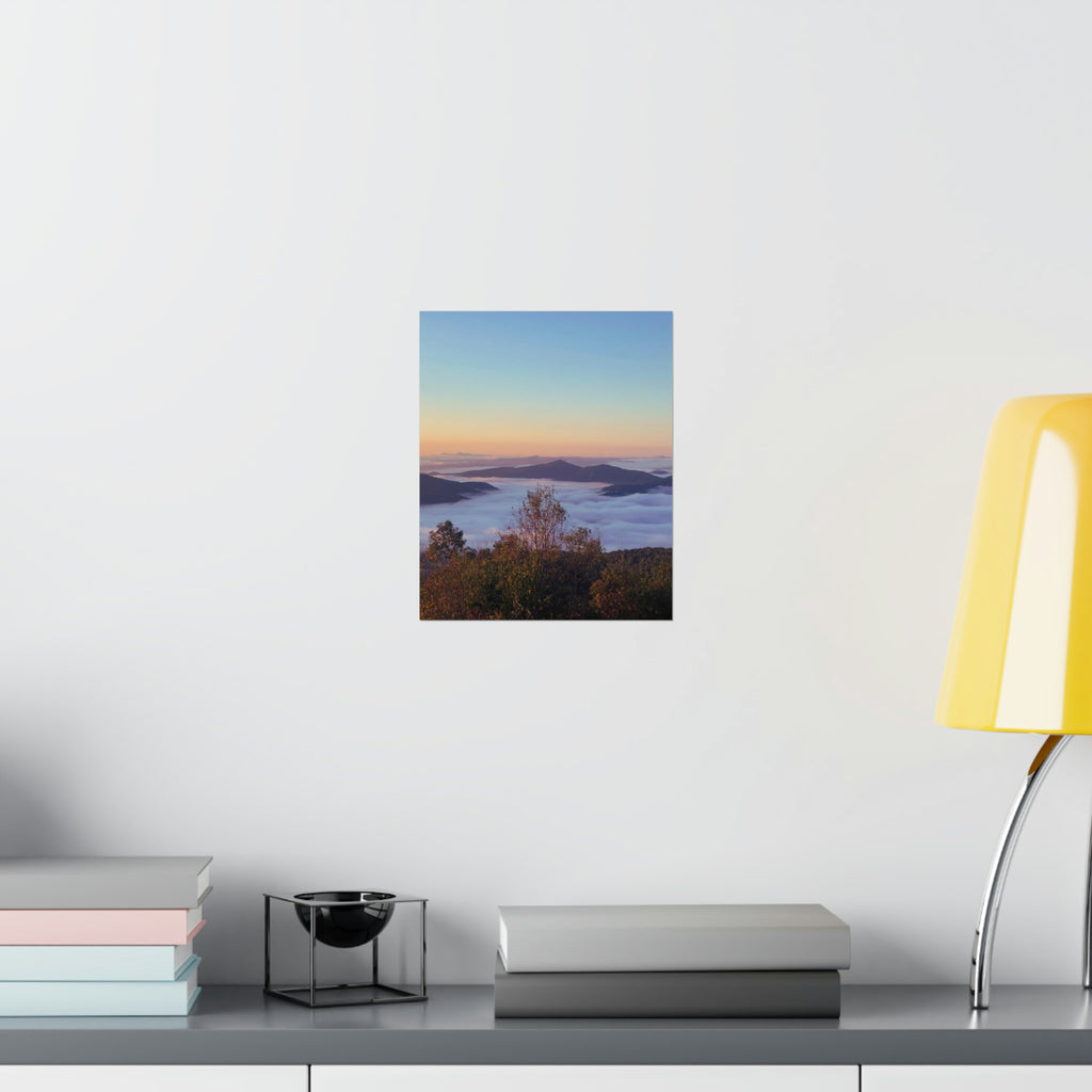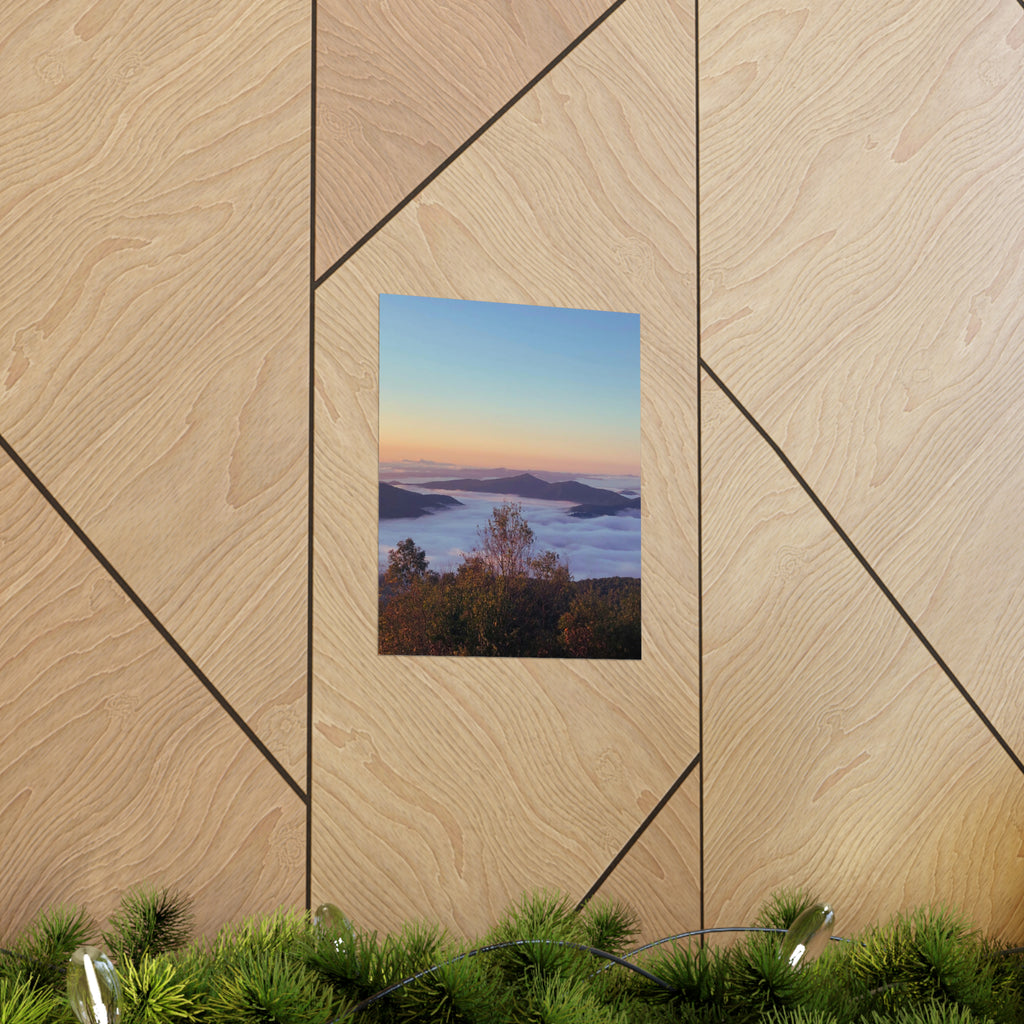 As dawn breaks over the Blue Ridge Parkway, misty clouds cloak the majestic mountains, casting an ethereal aura. Shades of blue and gray merge seamlessly, with hints of golden sunlight piercing through the mist, painting a breathtaking scene. Enjoy this wonderfully framed picture of this beautiful landscape.