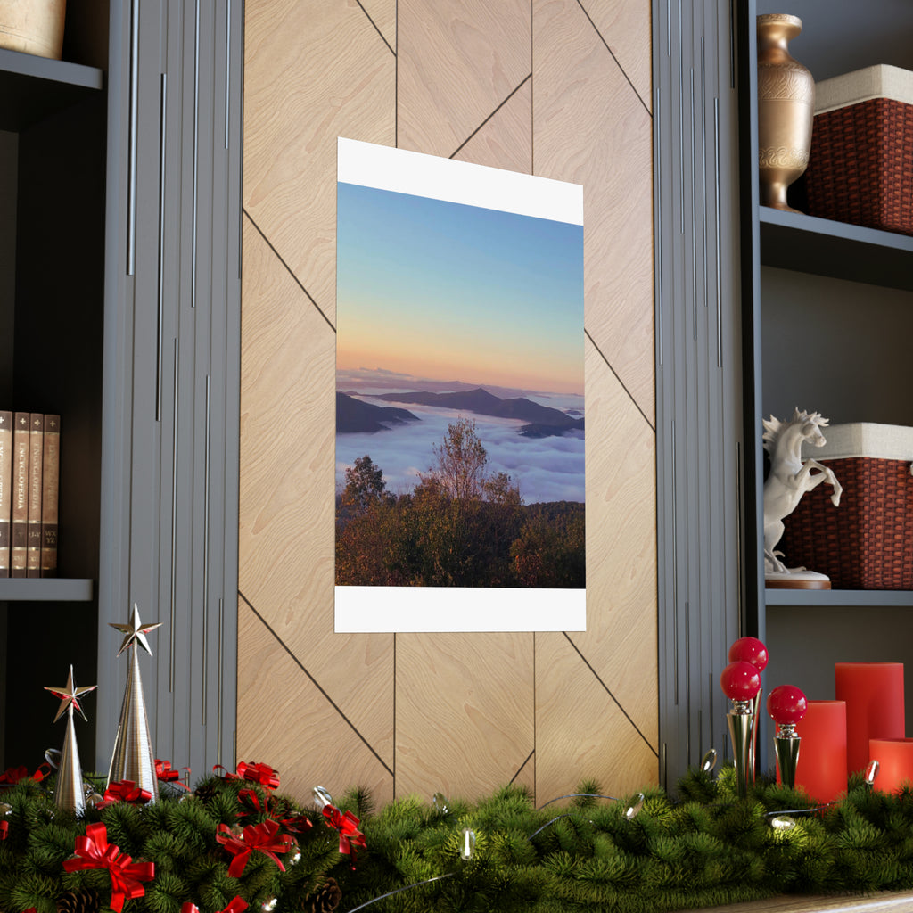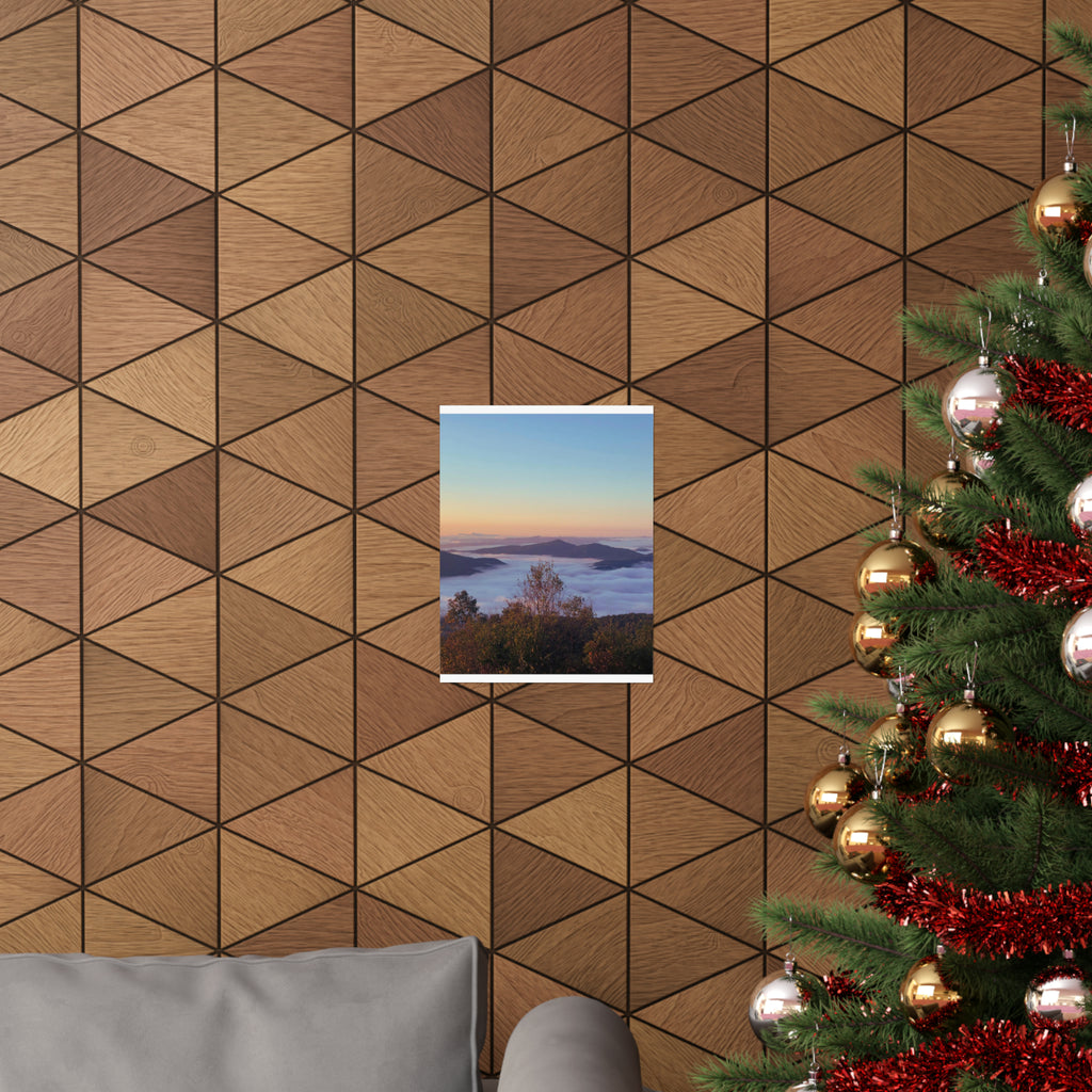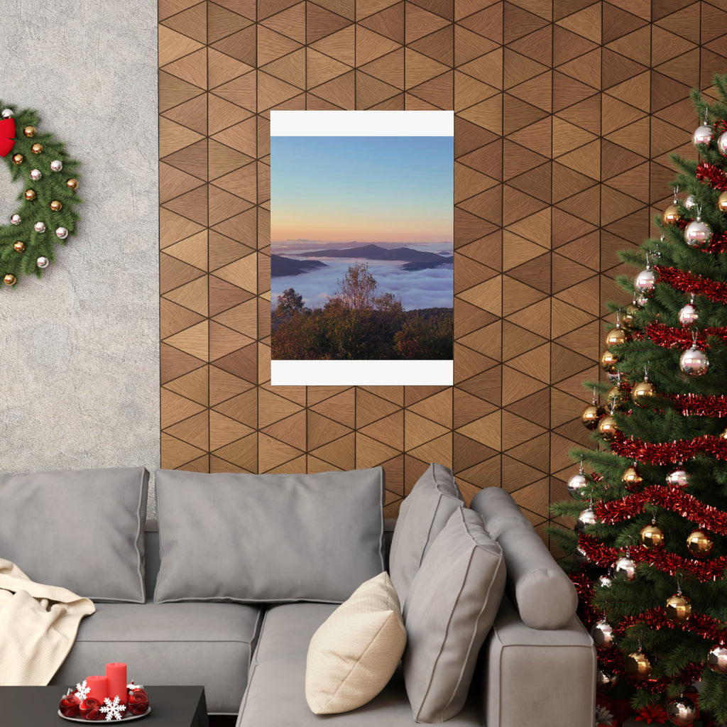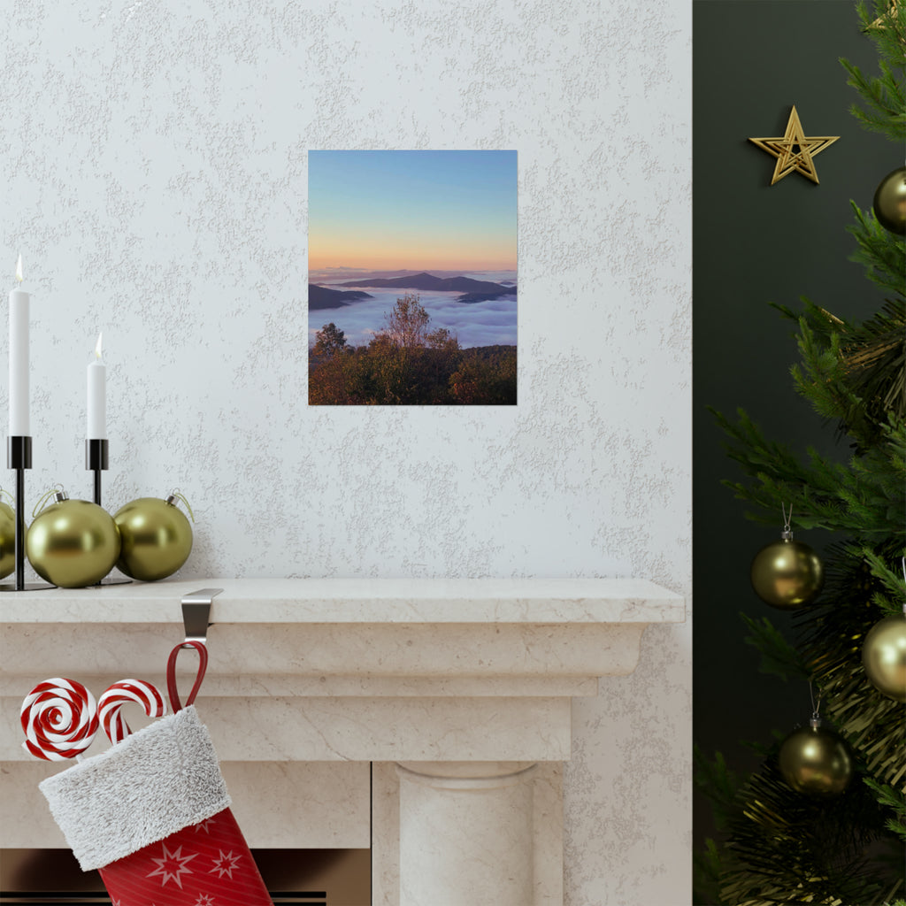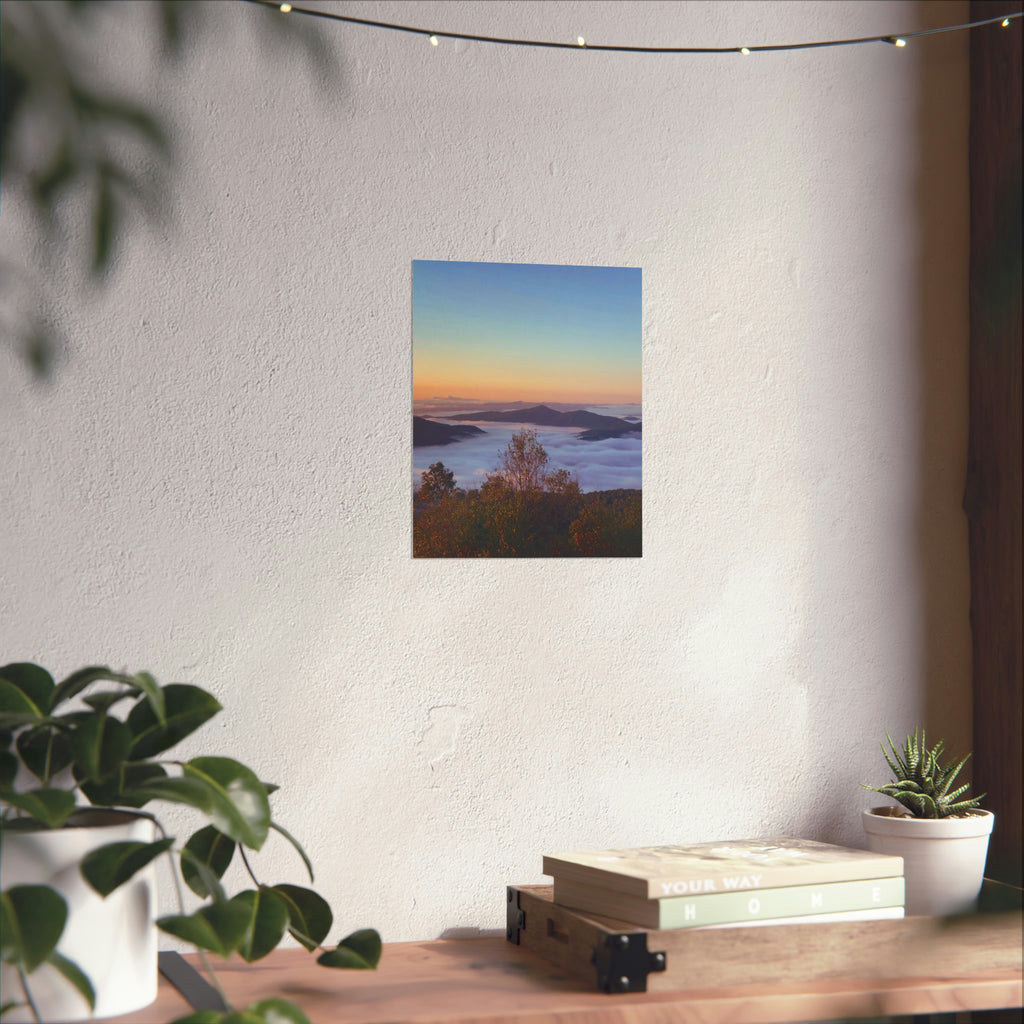 As dawn breaks over the Blue Ridge Parkway, misty clouds cloak the majestic mountains, casting an ethereal aura. Shades of blue and gray merge seamlessly, with hints of golden sunlight piercing through the mist, painting a breathtaking scene. Enjoy this wonderfully framed picture of this beautiful landscape.