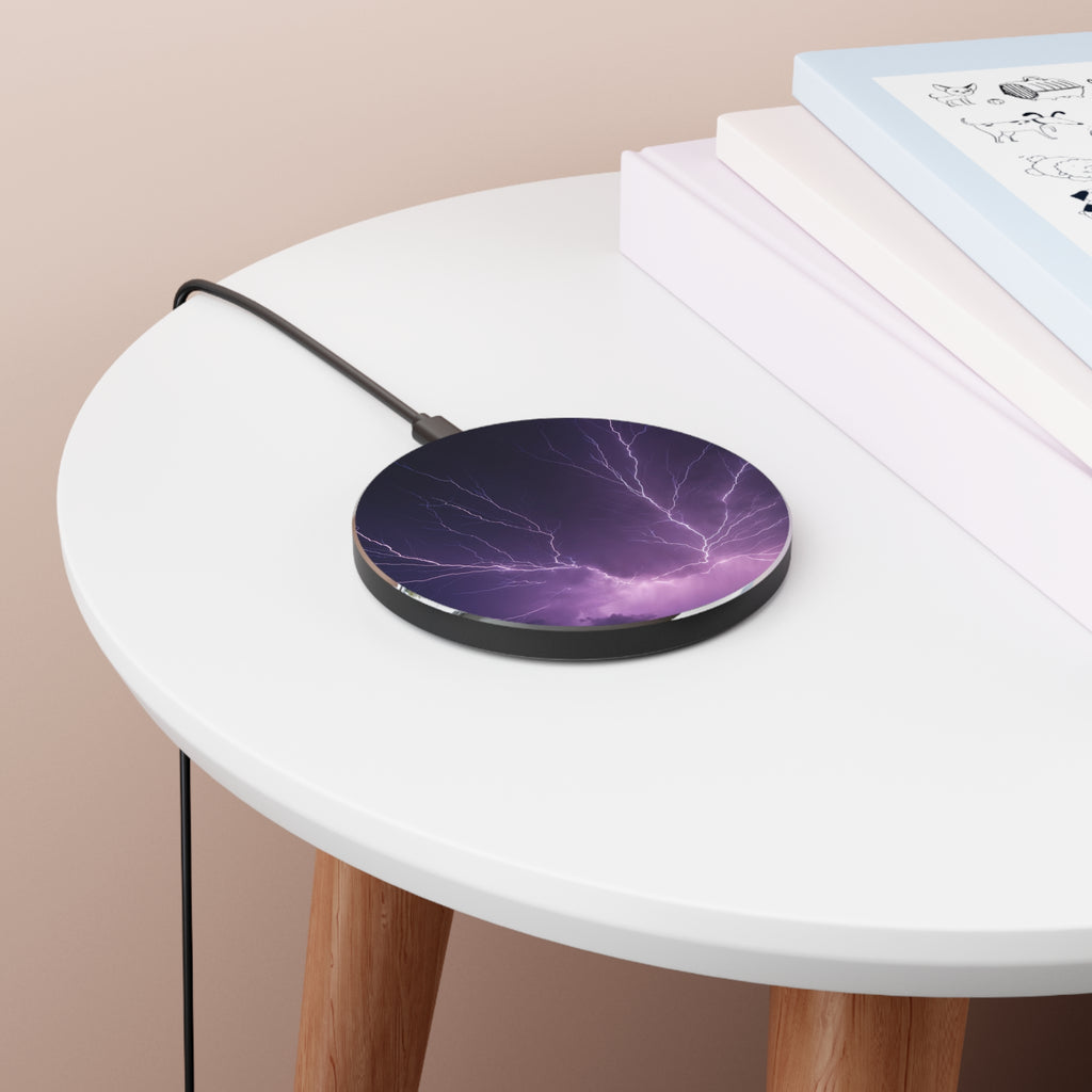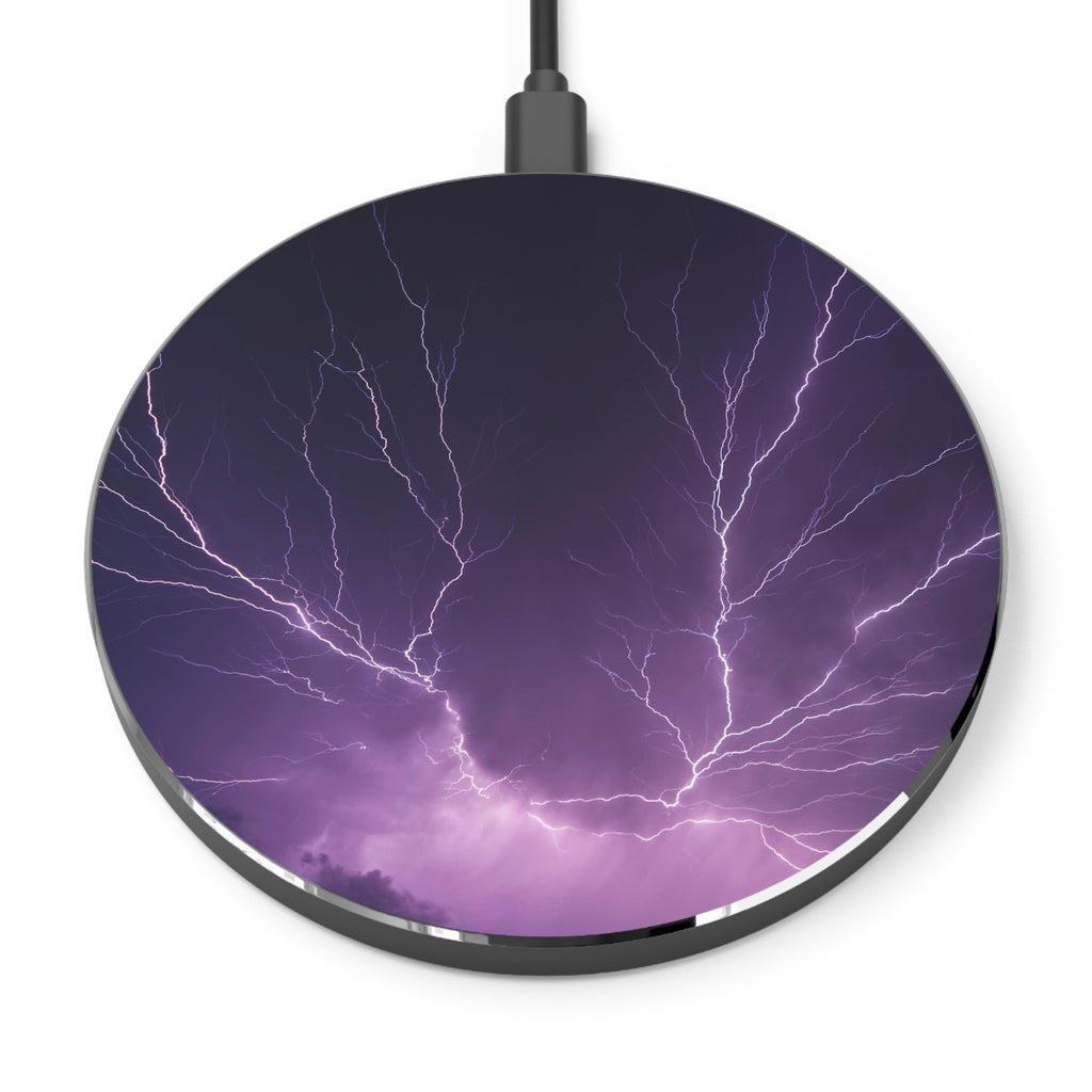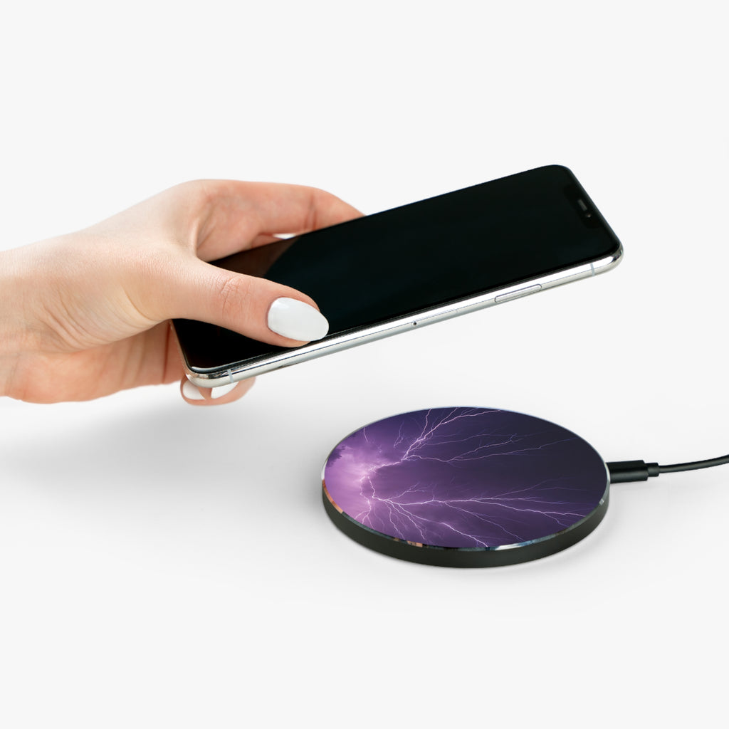 Introducing a sleek mobile wireless charger adorned with captivating lightning imagery. The charger's surface features a striking depiction of crackling lightning bolts against a backdrop of stormy skies, evoking a sense of power and energy. Compatible with all the latest iPhone and Android models that are wireless charging enabled. Each charger can be printed on with high-fidelity sublimation prints and ships with a micro USB cable.