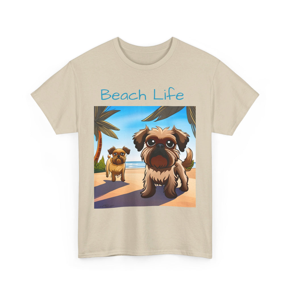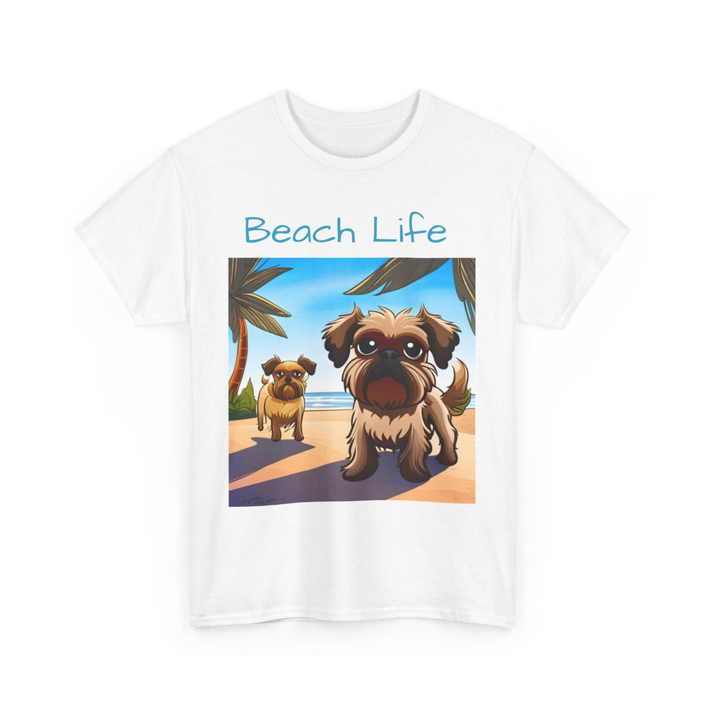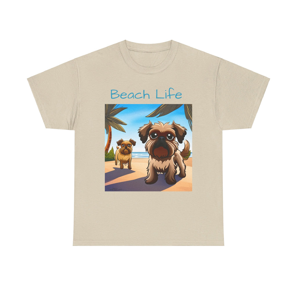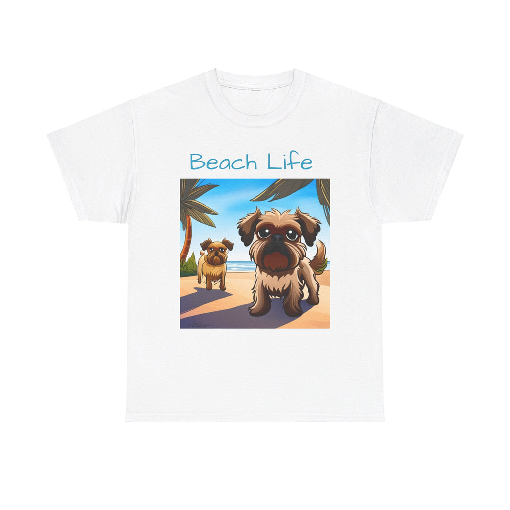 A comfy t-shirt featuring two adorable Brussels Griffon dogs on a sunny beach, with waves crashing and a vibrant sunset in the background, capturing a joyful and carefree summer vibe. These dogs are living their best "Beach Life!"